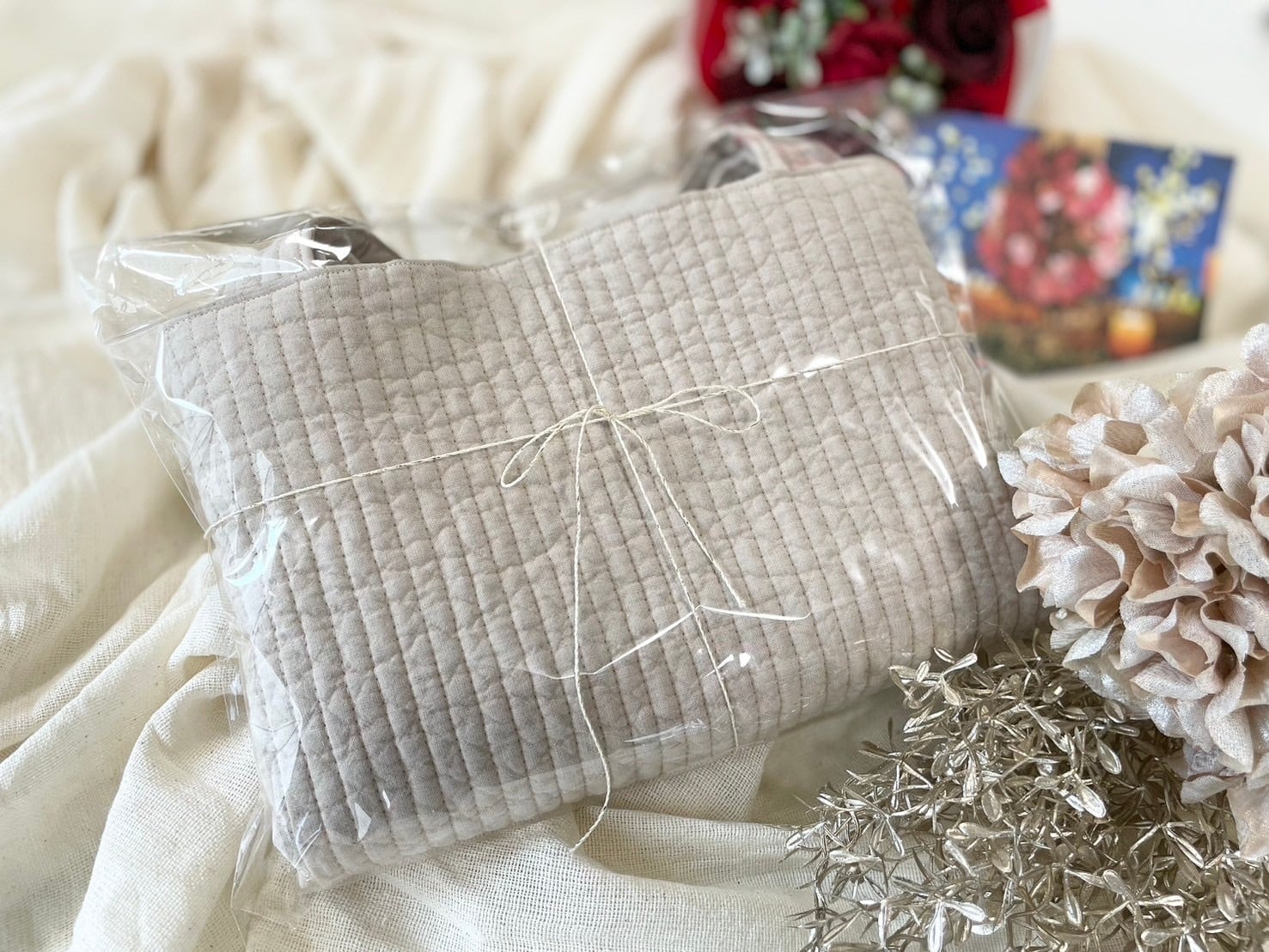 優しいベージュのヌビ生地で仕立てられたこのバッグは、シンプルながらもエレガントな印象を与えます。